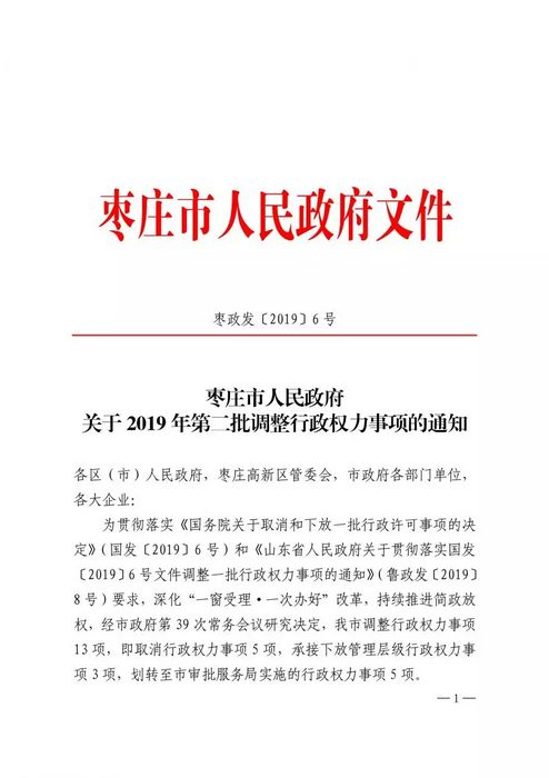 近日,枣庄市人民政府下发了《关于2019年第二批调整行政权力事项的通知》,对全市一批行政权力事项进行调整。本次调整共涉及行政权力事项13项,即取消行政权力事项5项,承接下放管理层级行政权力事项3项,划转至市审批服务局实施的行政权力事项5项。