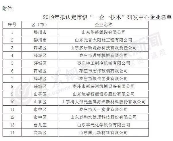 9月2日,枣庄市工业和信息化局公示了《2019年拟认定市级“一企一技术”研发中心企业名单》,公示期为2019年9月2日至9月9日。